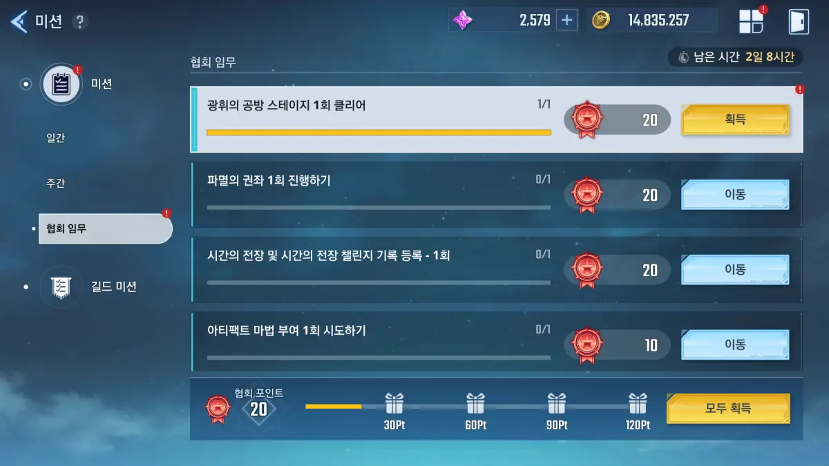 협회 임무는 기존 일간/주간 미션 아이콘을 클릭하면 쉽게 찾을 수 있다. 다른 미션처럼 던전 클리어나 마법 부여, 룬 합성 같은 퀘스트가 있고 클리어마다 협회 포인트를 받을 수 있다.