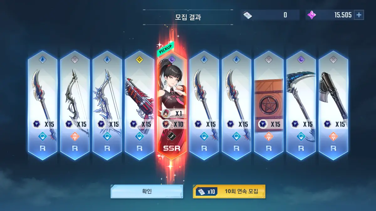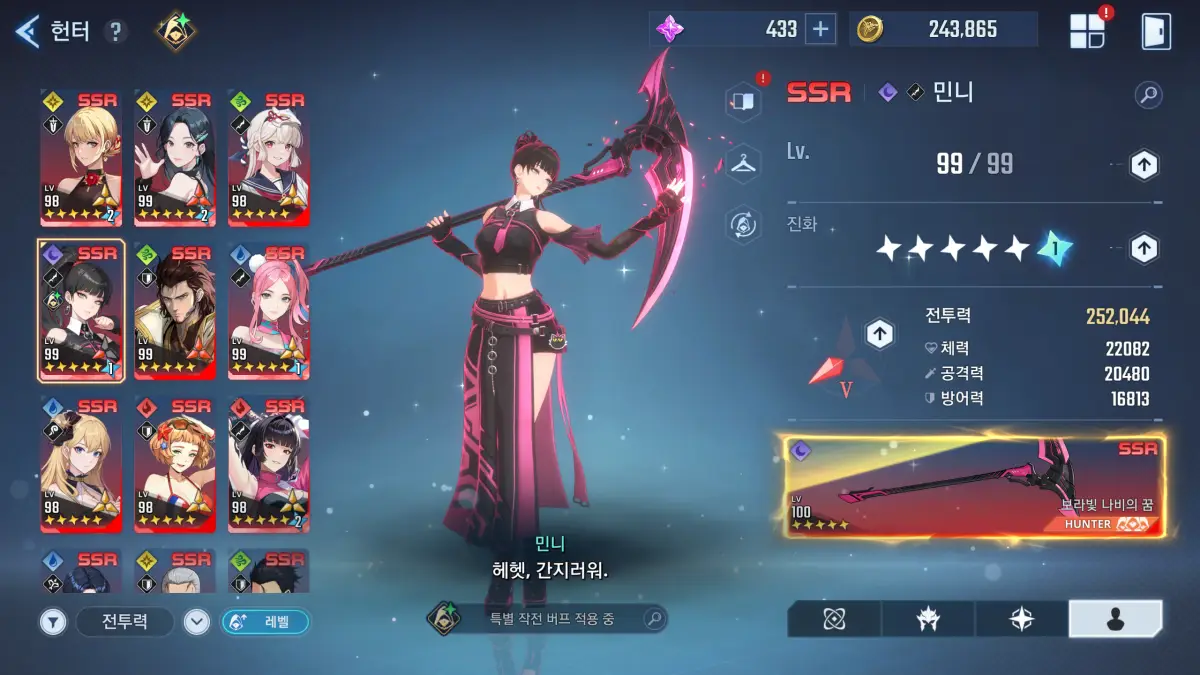민니를 5성으로 만든 것은 이렇다 할 암속성 딜러가 없었던 이유인데 뽑기 픽업과 무기 진화도 몰아주었다. 앞으로 파멸의 권좌나 다른 암속성 약점 보스 던전에서 유용하게 활용할 수 있게 되어 만족한다.
