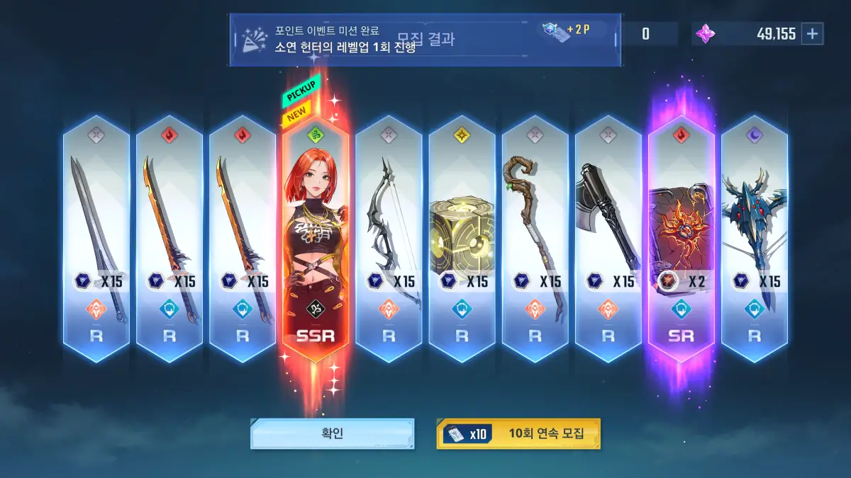 픽업 티켓과 마정석으로 뽑기 약 270번 정도 진행했는데 3명 모두 2번씩 뽑은 것 같다. 헌터를 2번 뽑으면 최초 획득 + 1번 진화 = 1성이 되는데 헌터 패스 이벤트로 멤버 데이터를 제공해서 모두 2성이 되었다.