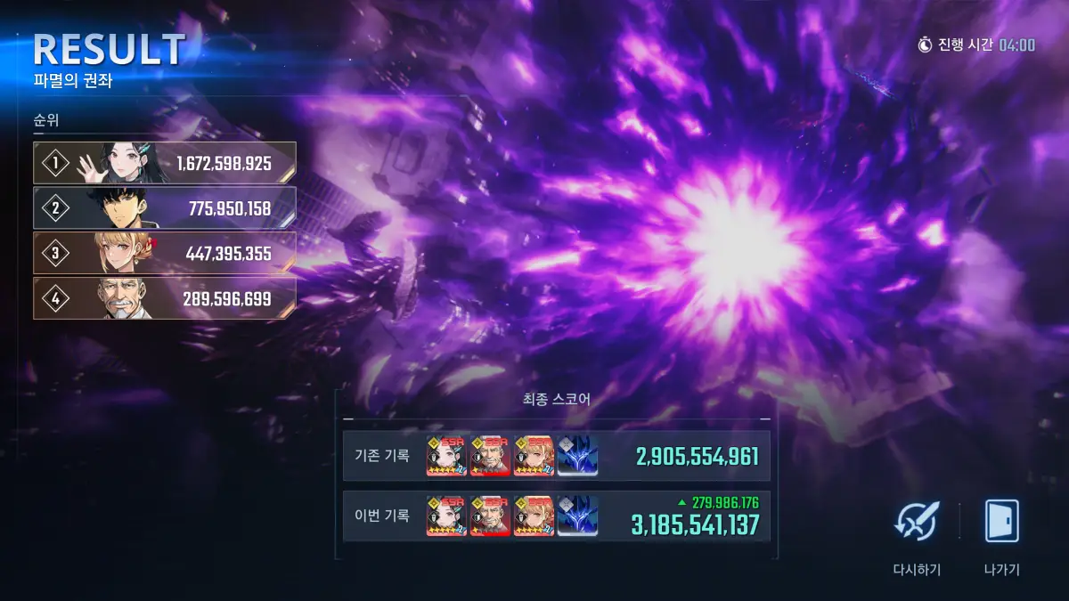 이렇게 되는 건 흔하지 않지만, 그래도 미연의 편성 유무에 따라 점수 차이가 커지는 것 같다. 덕분에 명속성 약점일 때 30억이 넘는 기록도 내보았는데 아쉽지만 불멸의 단죄 개방에 필요한 350억에는 한참 미치지 못한다.