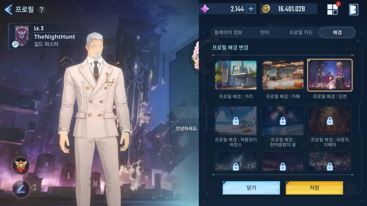 이번에는 프로필 화면 맨 왼쪽 아래 연필 모양을 클릭해 보자. 플레이어 정보는 닉네임/칭호/인사말 수정을 할 수 있고, 헌터 탭으로 오면 협회 로비 대표 헌터 지정도 가능하다.