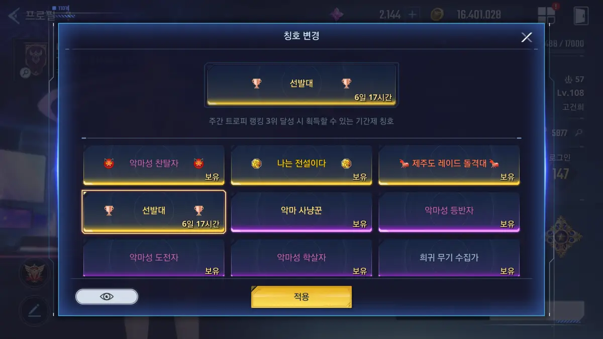 화면 왼쪽 눈 모양 아이콘을 클릭하면 보유 중인 칭호만 나오는 점도 참고하자. 원하는 이름을 선택하고 적용 버튼을 누르면 된다.