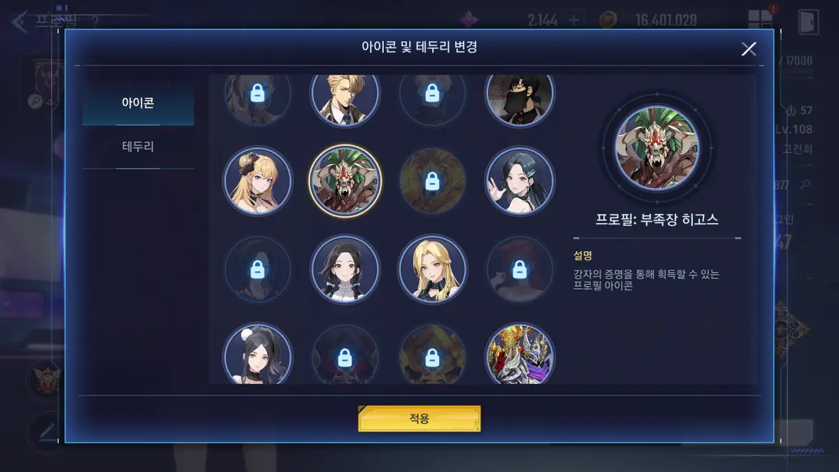 먼저 프로필 아이콘 그림을 클릭해서 아이콘을 변경할 수 있다. 원하는 이미지를 클릭하고 아래 적용 버튼을 누르면 된다.