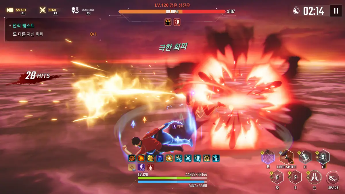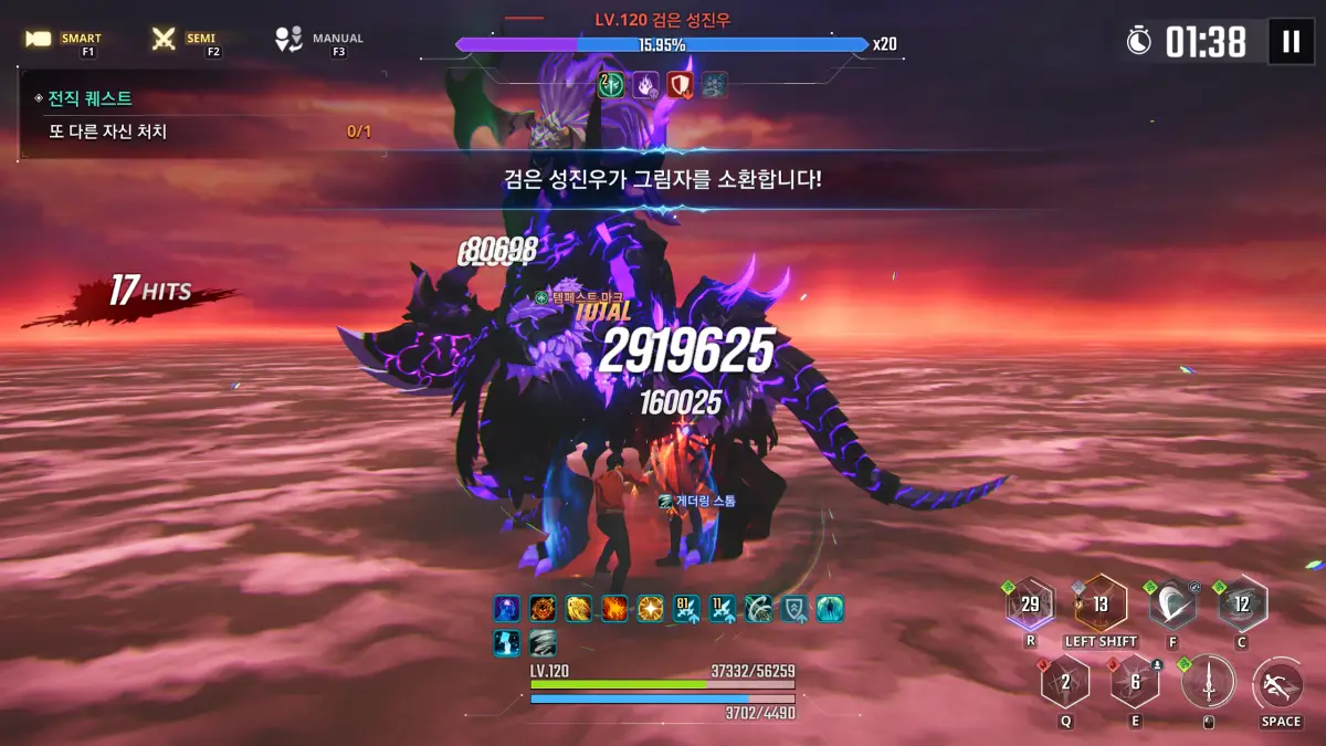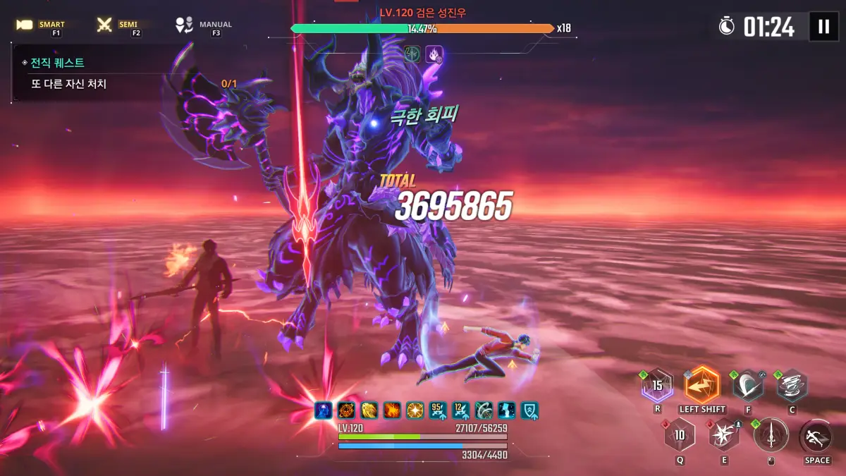 이번 120 전직 퀘스트도 예상을 깨지 않고 검은 성진우를 상대하면 된다. 전투를 시작하면 풍속성 무기 공격을 해오는데 워닝 사인을 보고 쉽게 피할 수 있다.