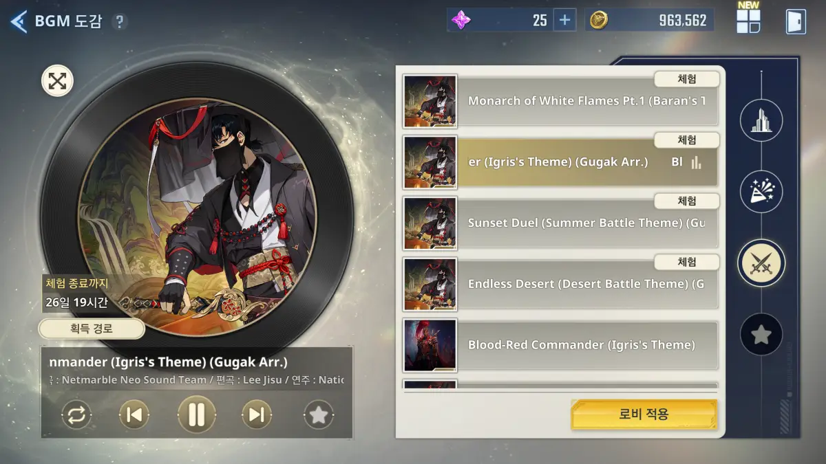메뉴로 들어오면 테마에 맞춘 음악 목록이 있고 '로비 적용' 버튼을 누르면 그대로 로비에 있을 때 해당 음악이 흘러나온다.