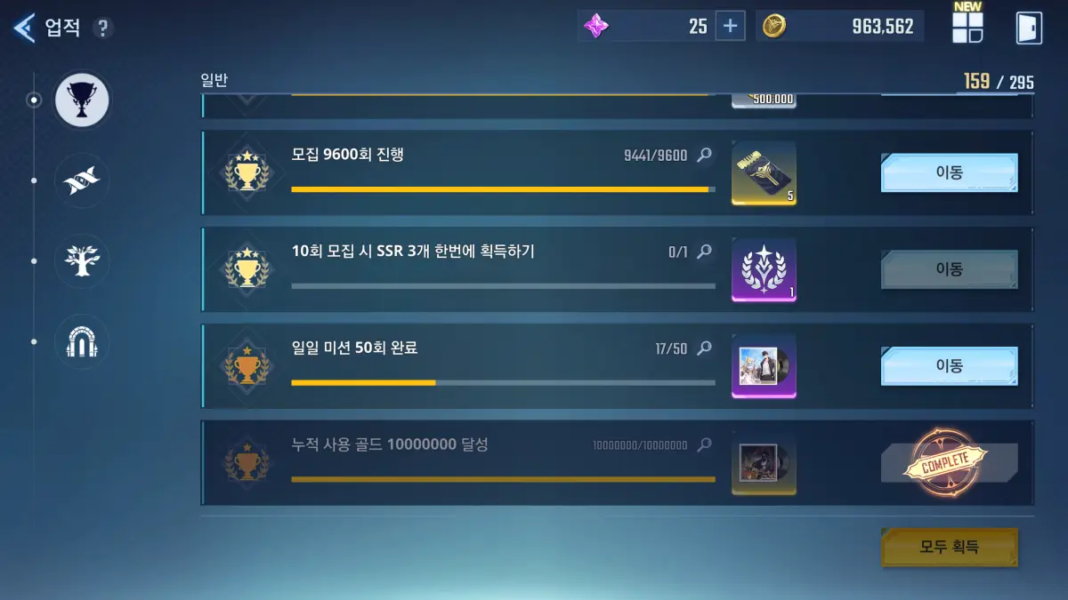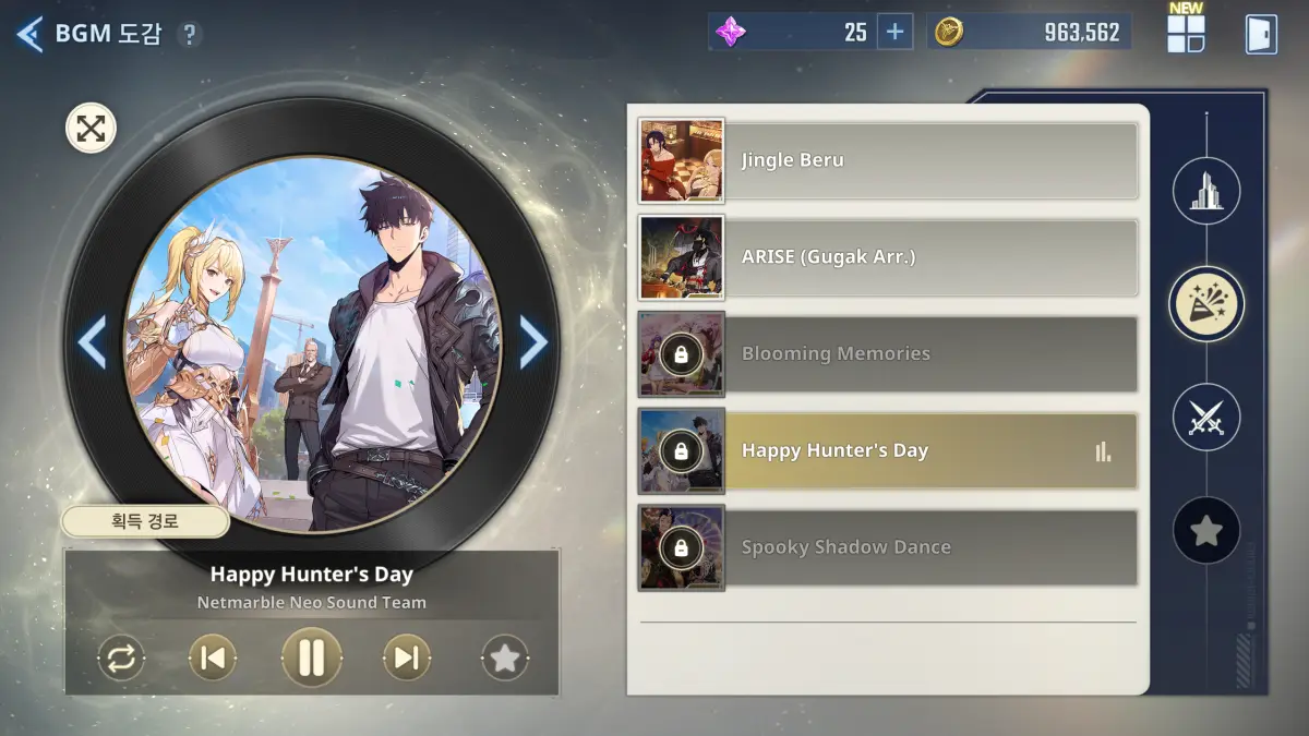 BGM은 일반, 수집, 육성, 던전 탭의 지정된 업적을 달성하면 얻을 수 있다. 조건은 굉장히 어려운 것은 아니고 게임 플레이를 하면 자동으로 깨지는 목록이 많다. 업적 클리어로 획득한 BGM은 조금 전 목록에 추가되고 이걸 로비에 적용하면 된다.
